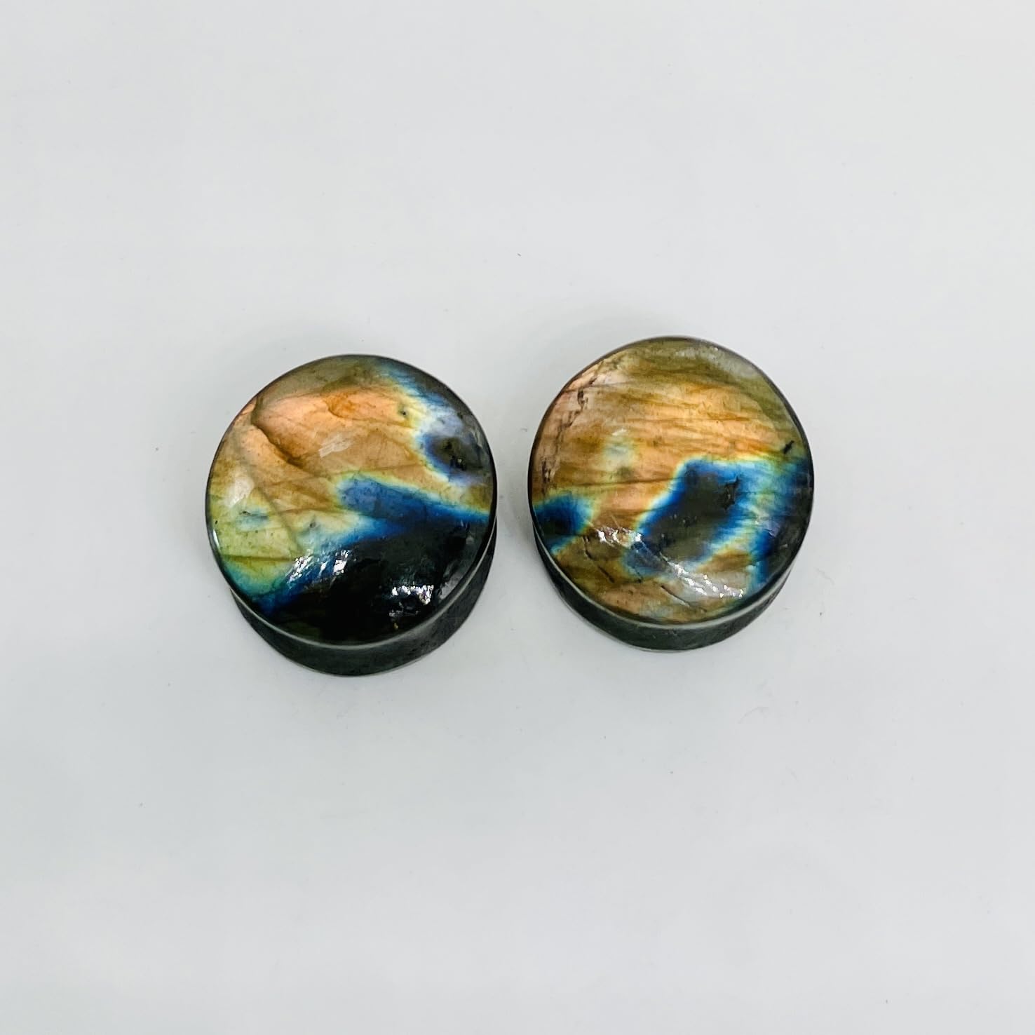 Natural Labradorite Stone Ear Plugs – 16mm (5/8") Double Flared Saddle Fit Gauges – Handcrafted Gemstone Pair – Polished Healing Crystal Jewelry for Stretched Ears