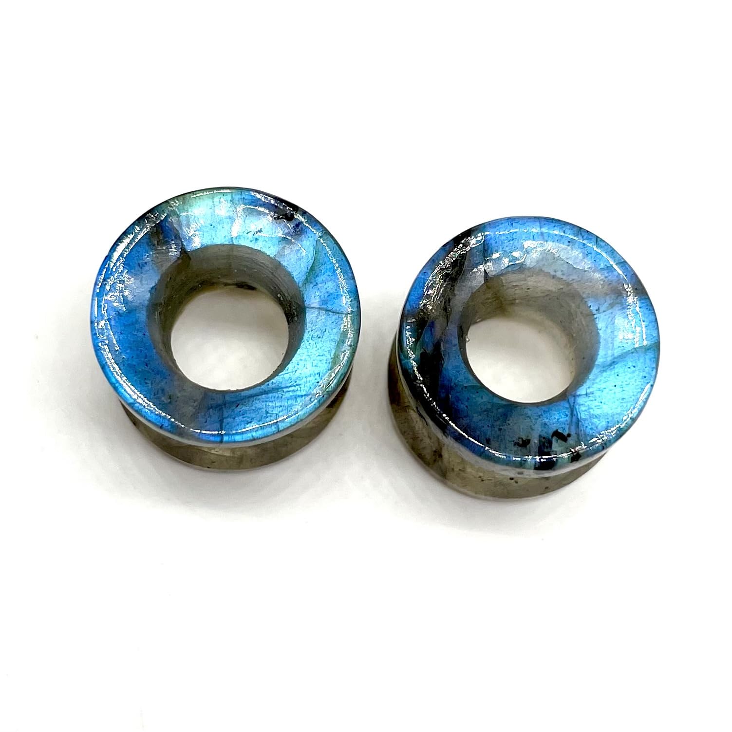 Pair of Natural Blue Flash Labradorite Crystal Handmade Ear Piercing Naga Body Jewelry Double Flare Round Shape Tunnel Plug Size 6g (4mm) to 1" (25mm) Customized Wholesale Also Available