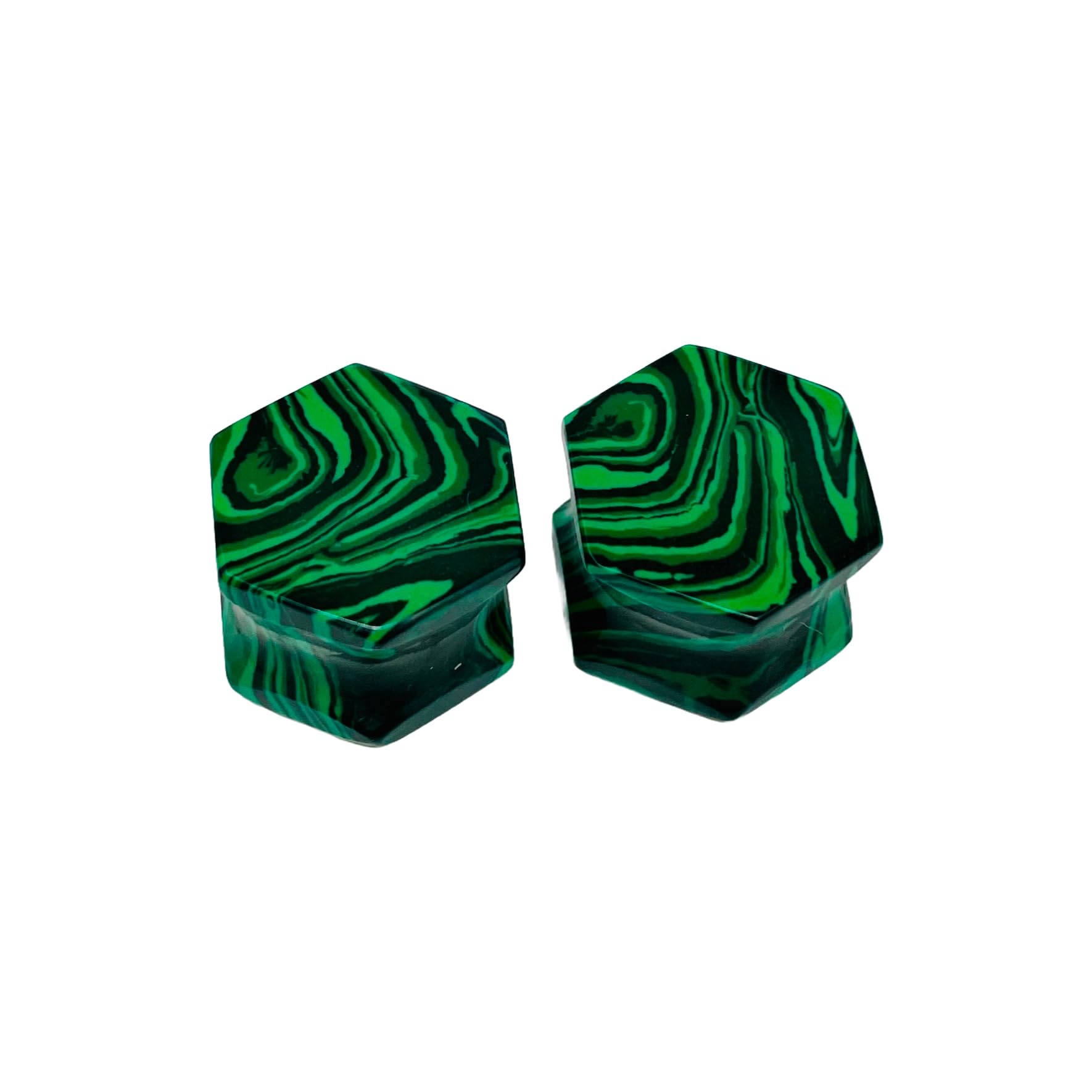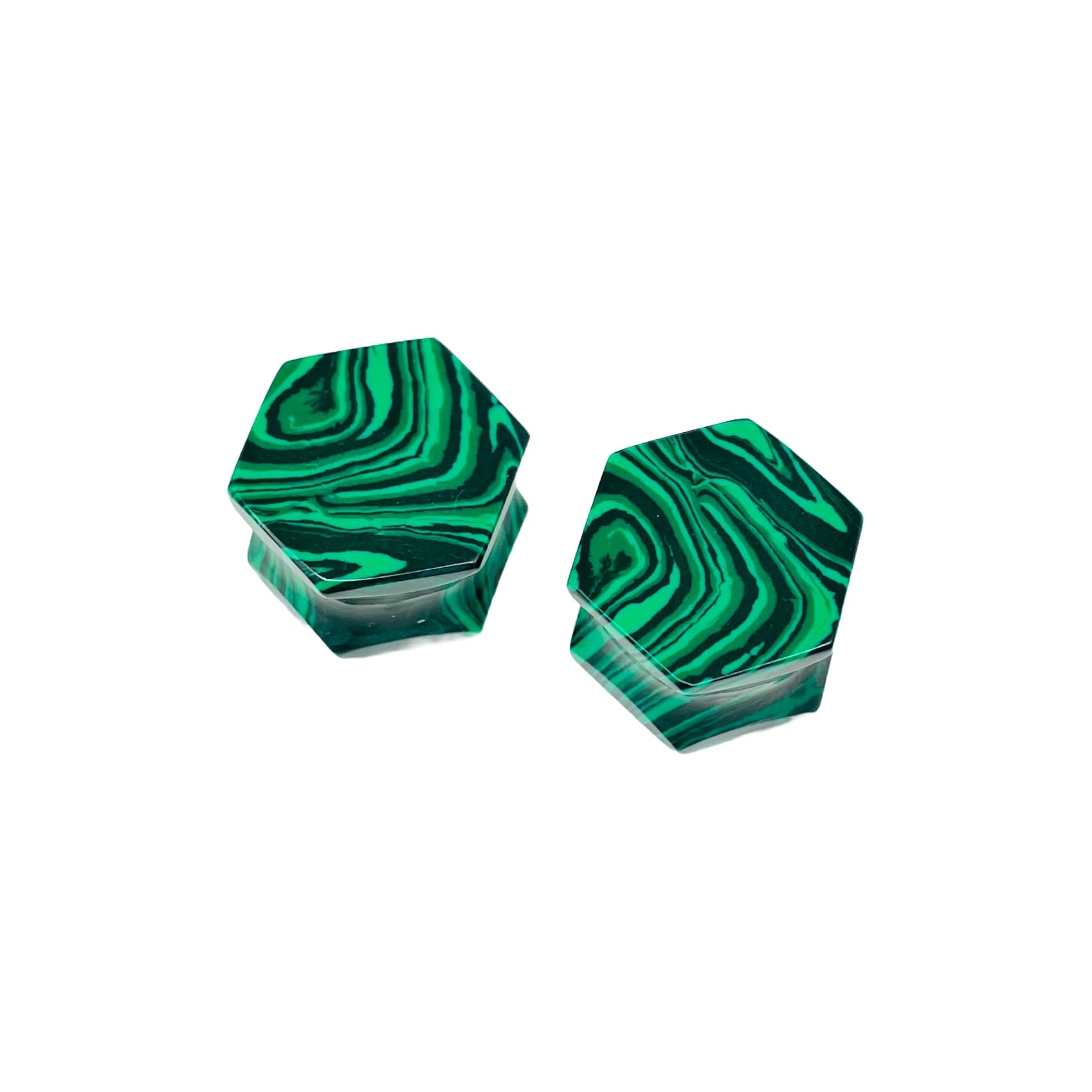 - Unique Design: Handcrafted double flared hexagon-shaped ear plugs featuring a striking green malachite crystal pattern.